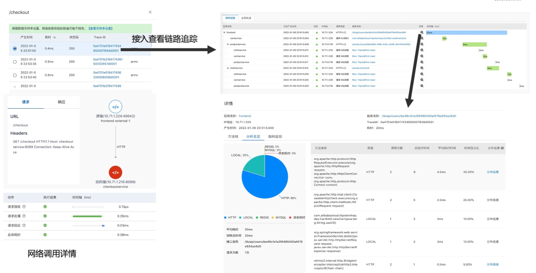 协议 Trace 同样是无入侵、语言无关的。如果请求内容中存在分布式链路 TraceID,能自动识别出来,方便进一步下钻到链路追踪。应用层协议的请求、响应信息有助于对请求内容、返回码进行分析,从而知道具体哪个接口有问题。如需查看代码级别或请求界别的详情,可点击 Trace ID 下钻到链路追踪分析查看。