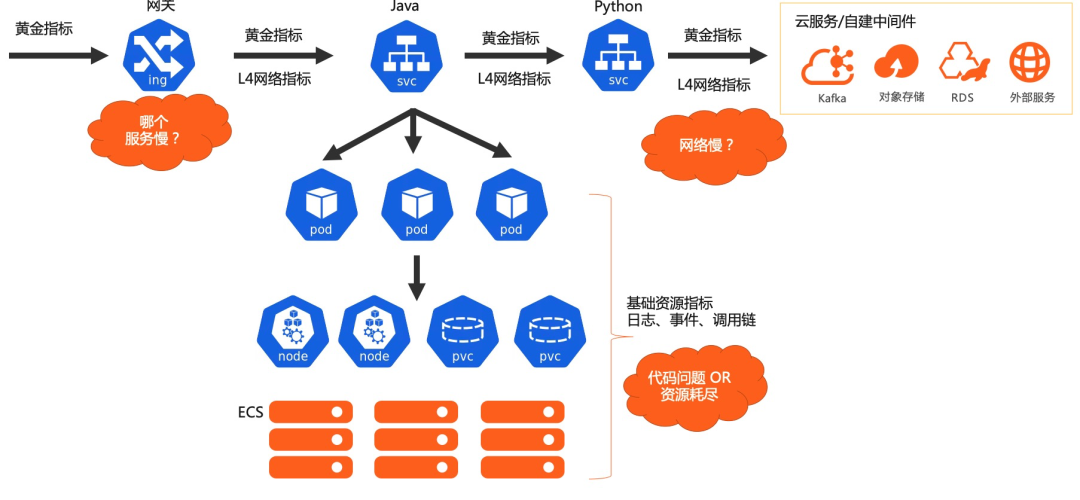 造成服务响应非常多,场景可能的原因有代码设计问题、网络问题、资源竞争问题、依赖服务慢等原因。在复杂的 Kubernetes 环境下,定位慢调用可以从两个方案去入手:首先,应用自身是否慢;其次,下游或网络是否慢;最后检查下资源的使用情况。如下图所示,Kubernetes 监测分别从横向和纵向来分析服务性能: