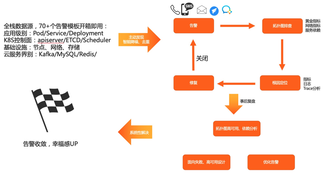 开箱即用的告警模板,各个不同层次全覆盖,不需要手动配置告警,将大规模 Kubernetes 运维经验融入到告警模板里面,精心设计的告警规则加上智能降噪和去重,我们能够做到一旦告警就是有效的告警,并且告警里面带有关联信息,可以快速定位到异常实体。告警规则全栈覆盖的好处是能及时、主动地将高风险事件报给用户,用户通过排查定位、解决告警、事后复盘、面向失败设计等一系列手段,最终逐步达成更好的系统稳定性。