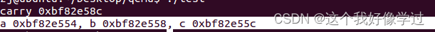 从这个输出可以看到,1、同一个函数内的局部变量的地址是按照定义的先后顺序递减的;2、主调函数的函数栈地址是高于被调函数的。且两者相差了0x20,中间应该是存放了什么寄存器以及函数返回地址这些,待验证