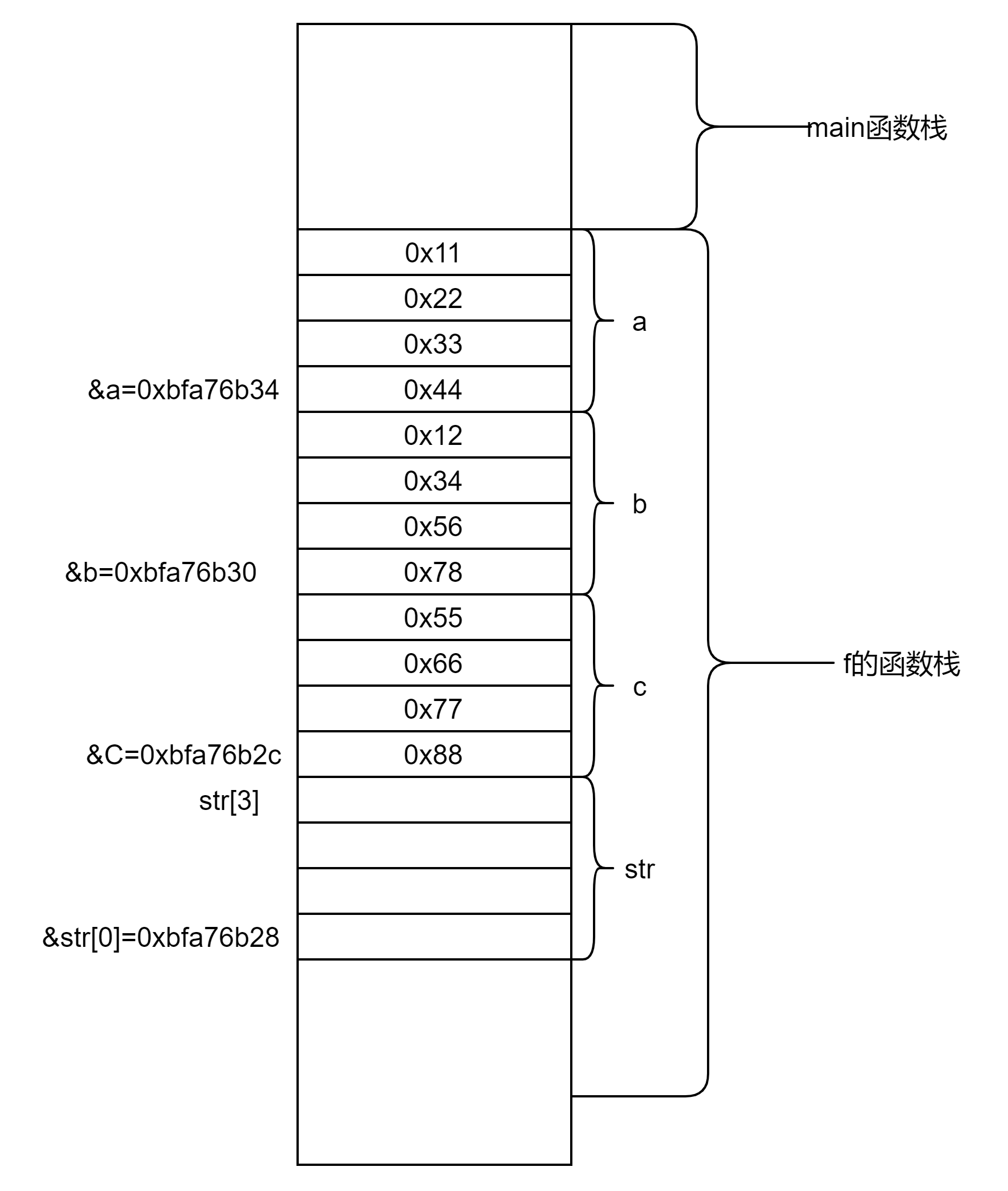 a 0xbfb1b8a4, b 0xbfb1b8a0, c 0xbfb1b89c, str 0xbfb1b898