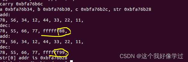从上图中可以看到.1、栈空间是向下生长的。 被掉函数的栈空间也是在主调函数的栈空间下方。2、在代码中我修改了str[4]=0x99,结果修改到了局部变量c的值,将0x88修改为了0x99(但是不明白为什么打印出来的值是0xffffff88和0xffffff99)。栈被踩坏应该就是说的这种情形,如果str继续往上写,可能就能把保存的信息给写坏