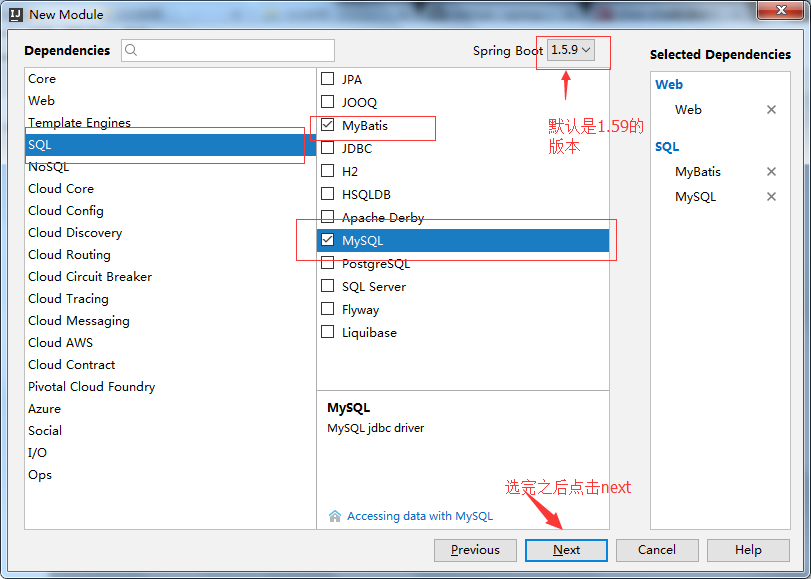 三.创建依赖时勾上web,mybatis,mysql(这个看你个人需要吧,可以自主选择)