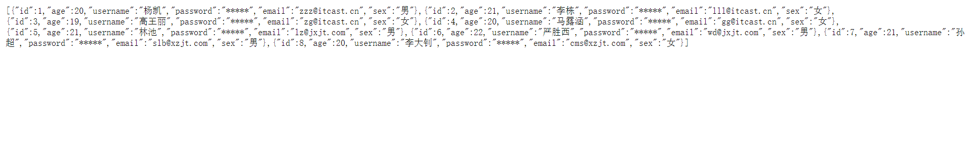 (2,21,'李栋','*****','lll@itcast.cn','女'),