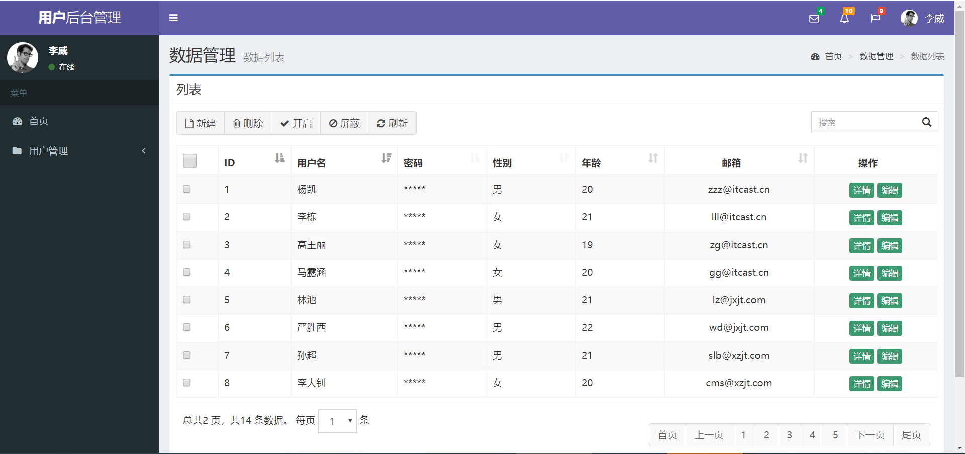 (5,21,'林池','*****','lz@jxjt.com','男'),