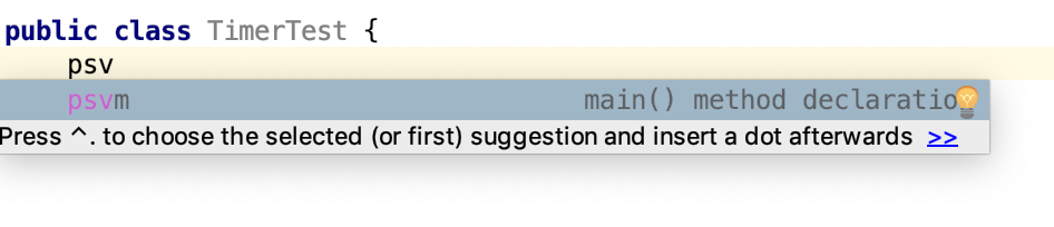 在编写代码的时候直接输入psv就会看到一个psvm的提示,此时点击回车键即可,一个main方法就写好了。