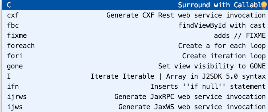 利用首字母缩写的特点,常用的语句例如System.out.println(); 可以使用sout快速得到。