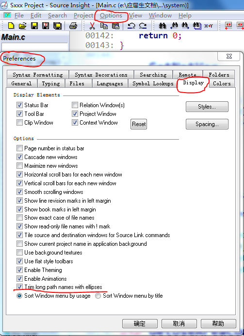 打开文件后最上面没有显示出文件的完全路径。首先选择Option—>Preferences—>Display选项。