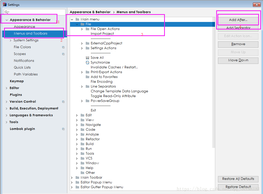 打开Main menu > File > 选中File 下边任意一个, 点击 右侧按钮 Add After