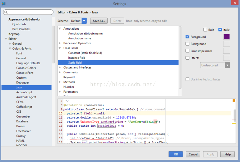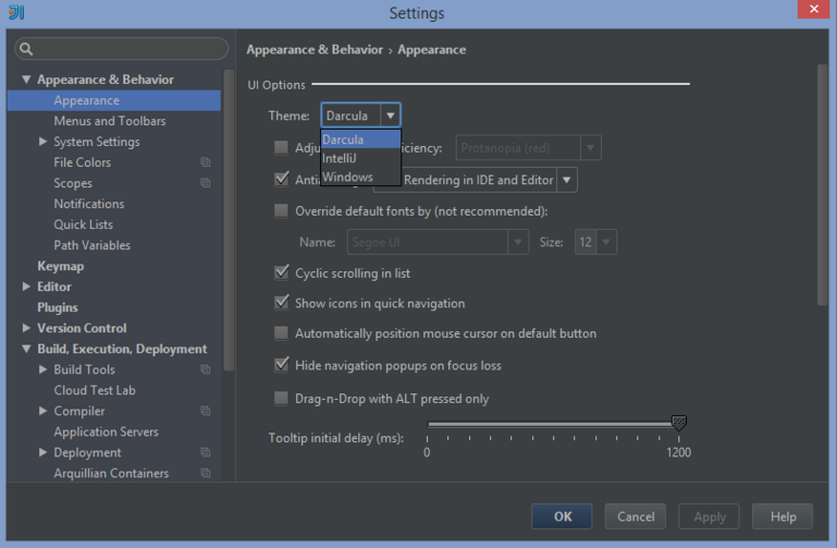 IntelliJ IDEA提供浅色的和深色的外观主题。可以有几个线色的,根据您的操作系统,和一个深色的一个叫做Darcula。