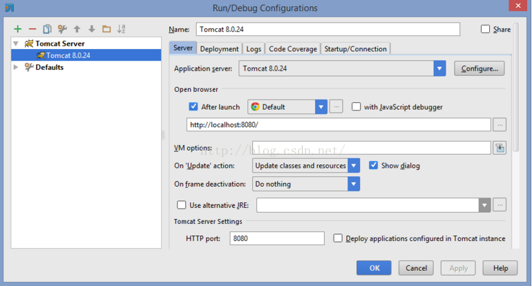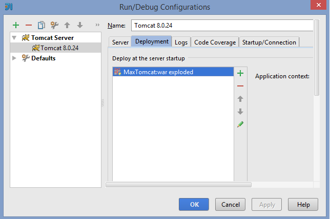一旦配置了应用程序服务器,创建一个相应的运行/调试配置,并指定应用程序服务器: