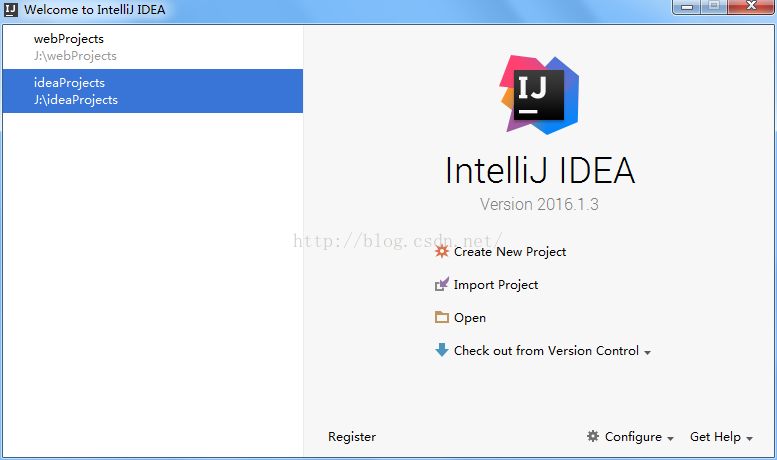 如果您已成功将IntelliJ IDEA安装在计算机上,是第一次运行它的时候了。您将看到欢迎屏幕,让你进到IDE中的主入口点。在这里,您可以创建一个新的项目,打开一个现有的或从版本控制中签出项目。