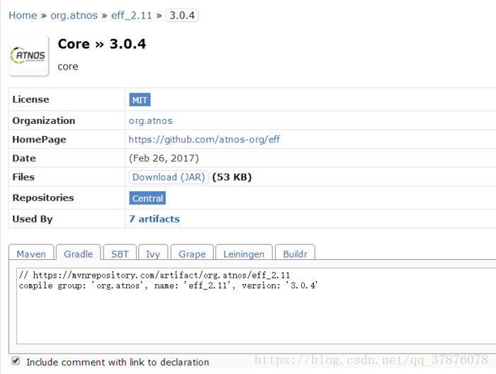 仓库只需要定义一次,通过上面的配置gradle就会从定义好的仓库中找到相应的依赖包下载下来并编译好,然后就可以直接在代码中使用了。在mvnrepository这个远程maven仓库中,它提供了引入相应依赖包的配置,只需复制下来黏贴到buil.gradle文件中即可。