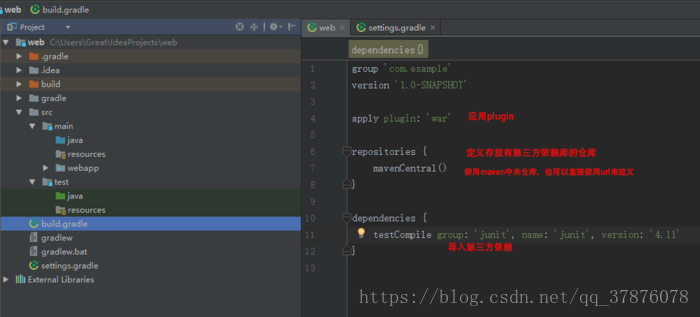 gradle官方提供很多常用的build plugin,比如我们这次创建项目引入的war ,它是继承自java这个plugin,在实现'java.plugin'中关于build java程序的基础上,额外的定义了java web 的项目的目录,打包war包等功能,剔除了打包jar包等功能。