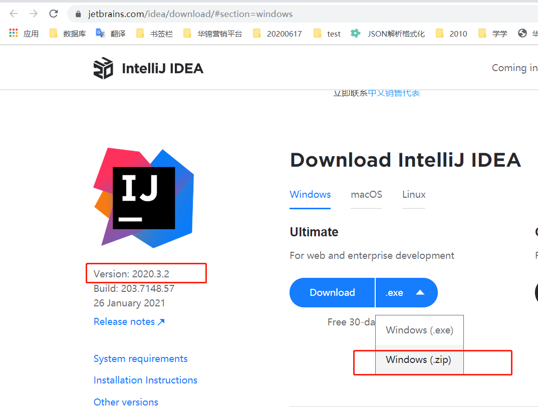 1、下载IDEA https://www.jetbrains.com/idea/download/#section=windows ;我选择下载解压版。