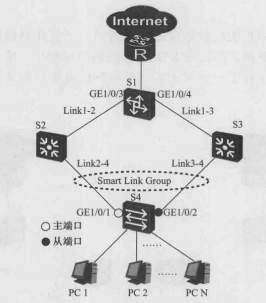 如图所示,交换机S4上配置了一个Smart Link组,GE 1/0/1为其主端口, GE1/0/2为其从端口。正常情况下,主端口 GE1/0/1处于转发状态,从端口 GE1/0/2处 于待命状态,所以真正处于工作状态的链路有Linkl-3、Link 1-2. Link2-4,而Link3-4 则处于中断状态,这就避免了环路的产生。如果主端口 GE1/0/1本身突然发生故障, 或者主端口 GE1/0/1感知到了 Link2-4的中断,那么Smart Link组就会立即将主端口 GE1/0/1设定为阻塞状态,同时立即将从端口 GE1/0/2的状态从待命状态切换到转发状 态。这样一来,真正处于工作状态的链路就立即变成了 Linkl-3、Link 1-2, Link3-4, 而Link2-4则处于中断状态。这样一来,既保证了网络的连通性,又避免了任何环路的 产生。注意,Smart Link协议是与STP协议互斥的,所以图10-15所示的网络中是没 有运行STP的。