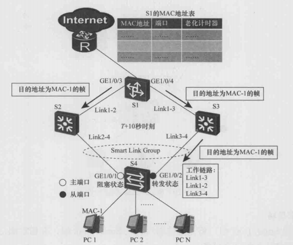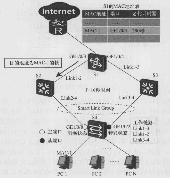 如下图的左半部分所示,交换机S4上配置了一个Smart Link组,GE1/0/1为其主 端口 ,GE 1/0/2为其从端口,目前网络处于正常工作状态,即Link3M处于中断状态.Link 1-3. Linkl-2、Link2-4都处于工作状态。另外,我们假定PC 1的网口的MAC地址为MAC-1。