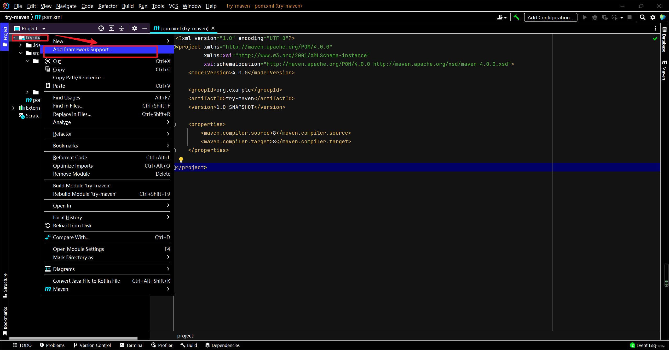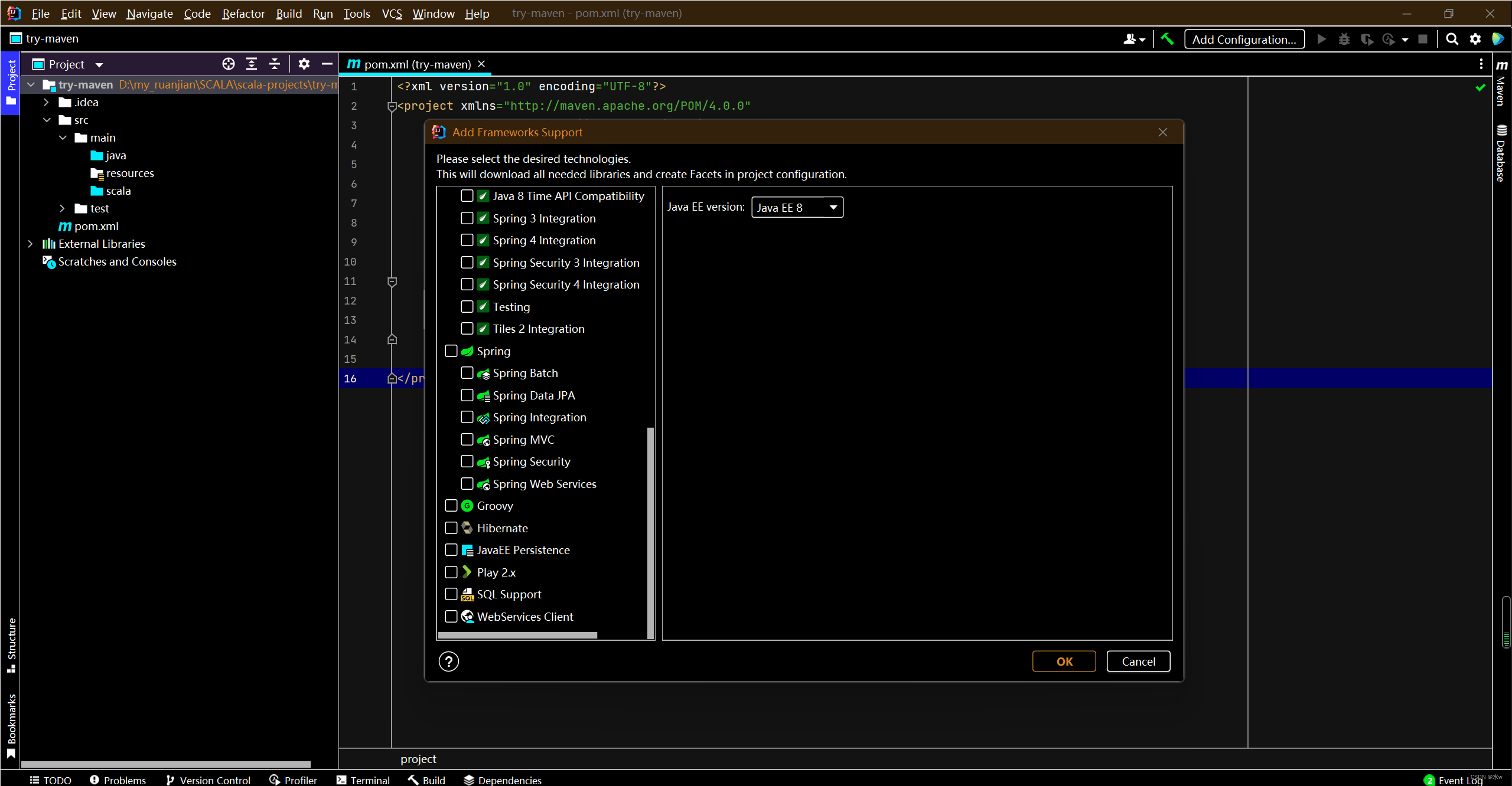 右击根目录“try-maven”,选择“add frameworks support”,准备添加scala插件时却发现找不到,没有找到Scala,