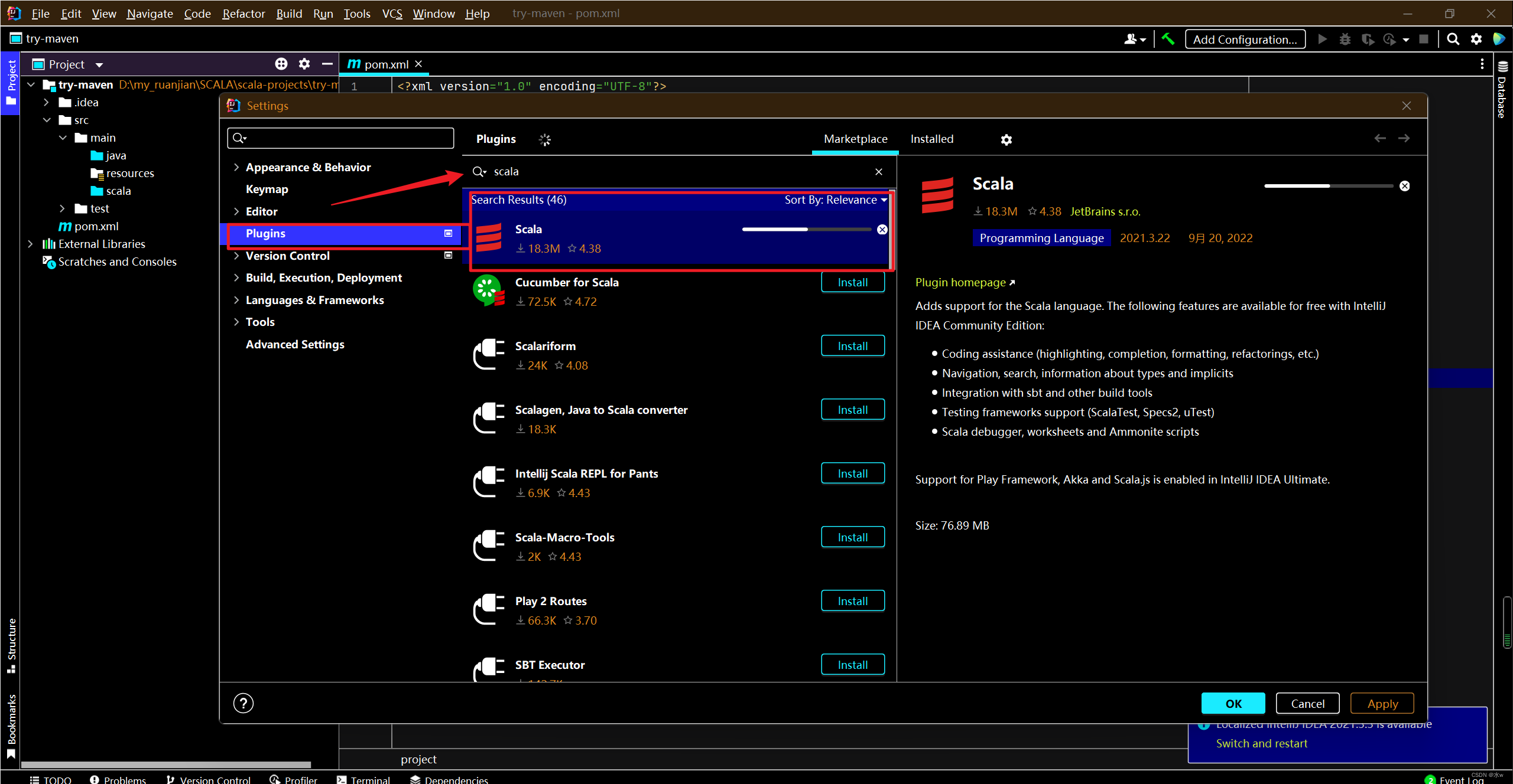 (4)添加scala插件,前提是先在settings-plugins中下载安装哦(附步骤),