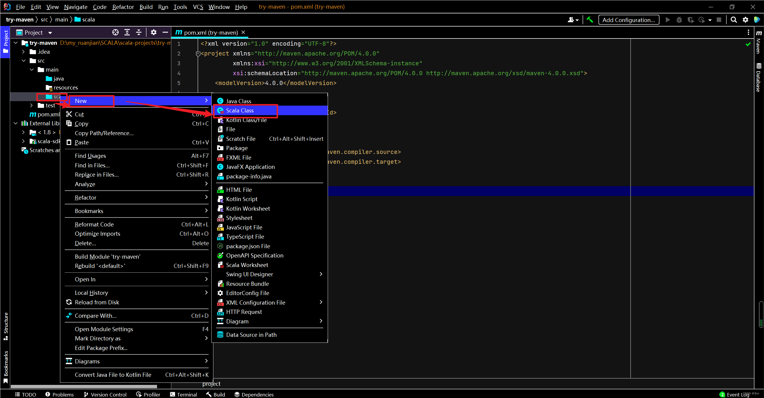 (7)以上配置都完成后,就可以在scala上点击右键创建scala class了,
