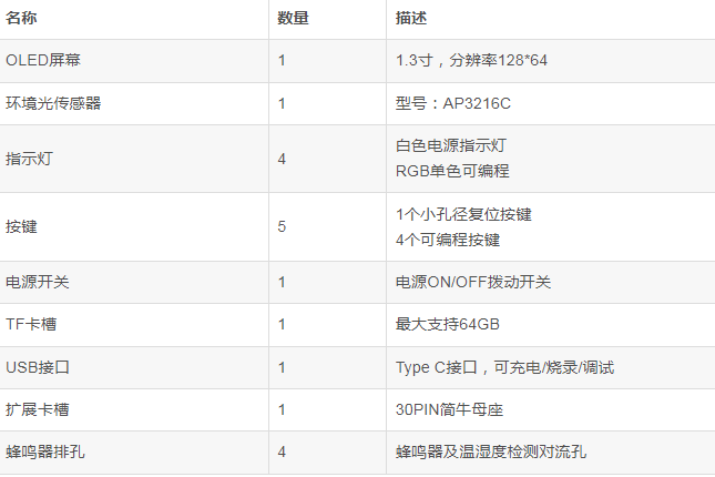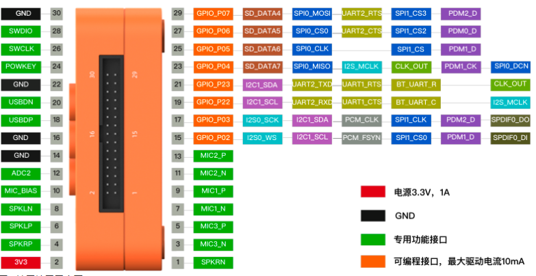 除已有板载功能之外,还有30PIN扩展接口,主要扩展有1路ADC输入、1路USB HOST、1路SWD调试、2路SPK输出、3路MIC输入、8路GPIOs等,其中GPIO_P02和GPIO_P03与主板的传感器一起复用为I2C模式,其他6个GPIOs可随便定义,并且每路GPIO的最大驱动电流是10mA。
