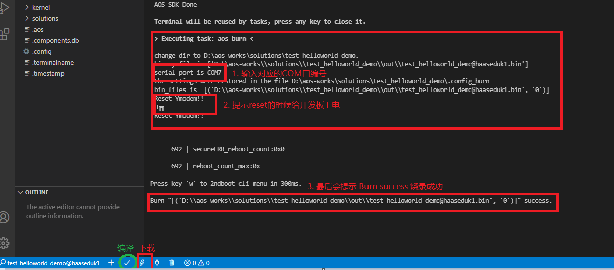 新建工程的右侧有一个对号,就是编译,点击编译即可开始编译。第一次编译时间较长,要等待编译工具的下载,最后出现success和build target即表示编译成功。