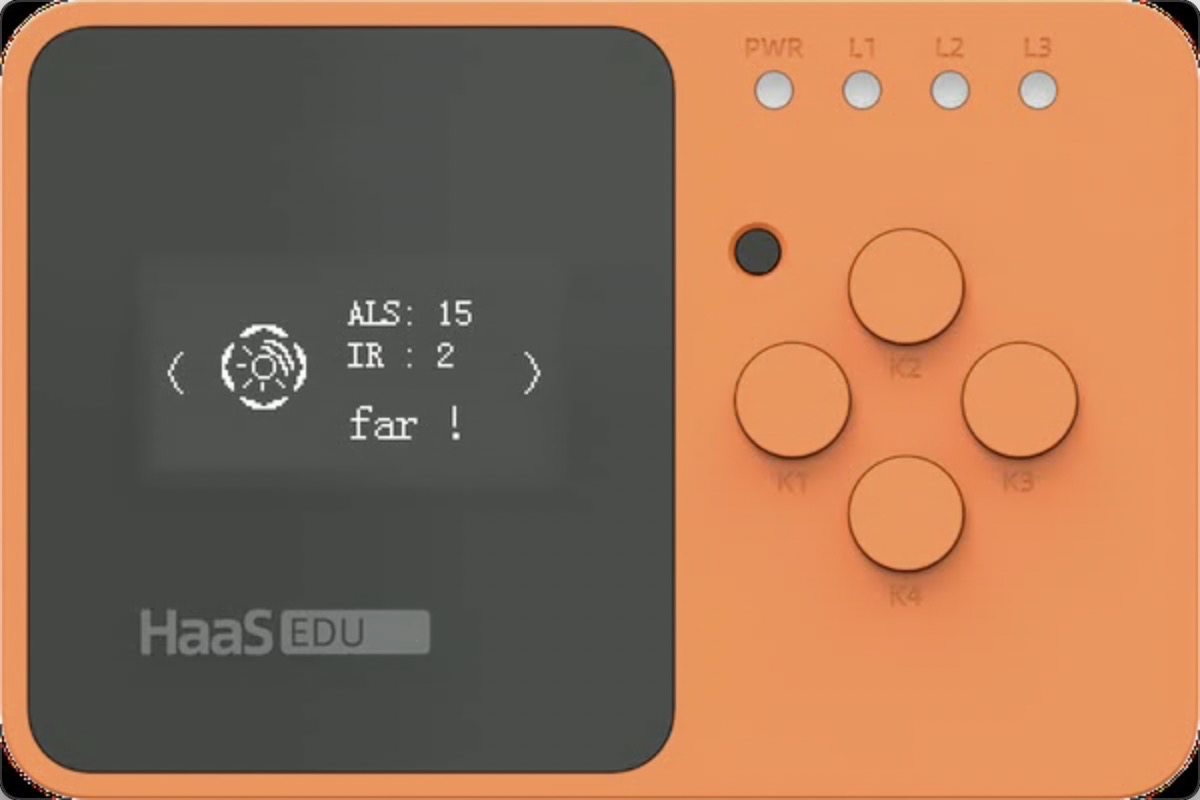 本实验的主要结果是通过I2C总线控制光强度传感器AP3216C对环境光强度及物体接近情况进行测量并获取环境光强度及是否有物体靠近,然后通过OLED显示屏将读取到的光强度、接近程度、红外信息显示在HaaS EDU K1的屏幕上。