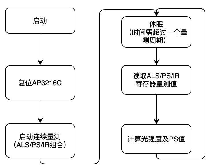 对AP3226C进行复位之后,设定工作模式(连续/单次测量,ALS/PS/IR组合设定),之后等待硬件测量稳定时间,再发起读取测量值的过程。