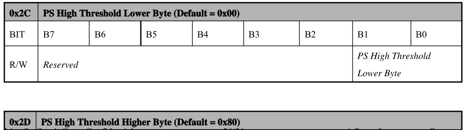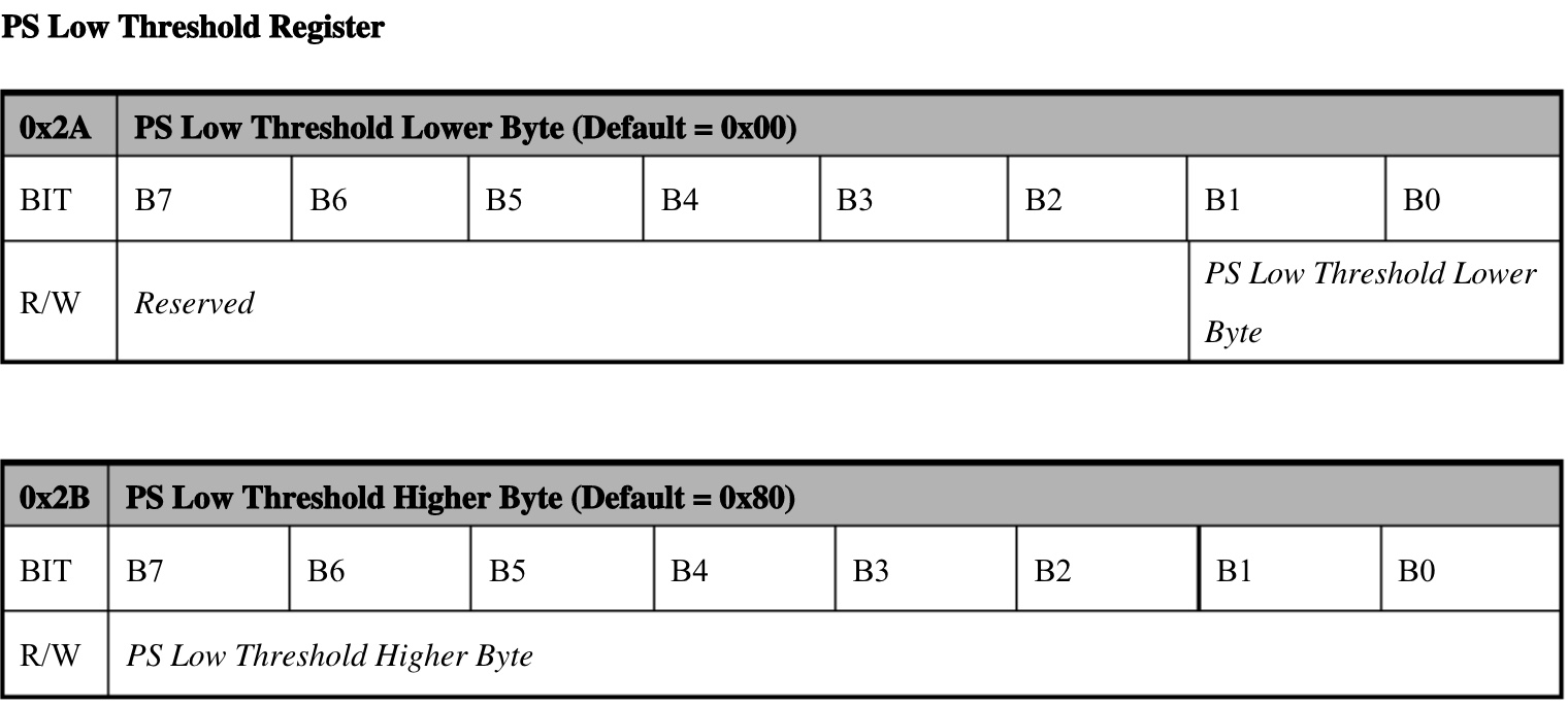 AP3216C判断物体靠近和远离的动作是通过两组PS 高低阈值寄存器和PS Data寄存器进行比对,PS Data高于PS High Threshold之后,则判定为物体远离;PS Data低于PS Low Threshold之后,则视为物体靠近。