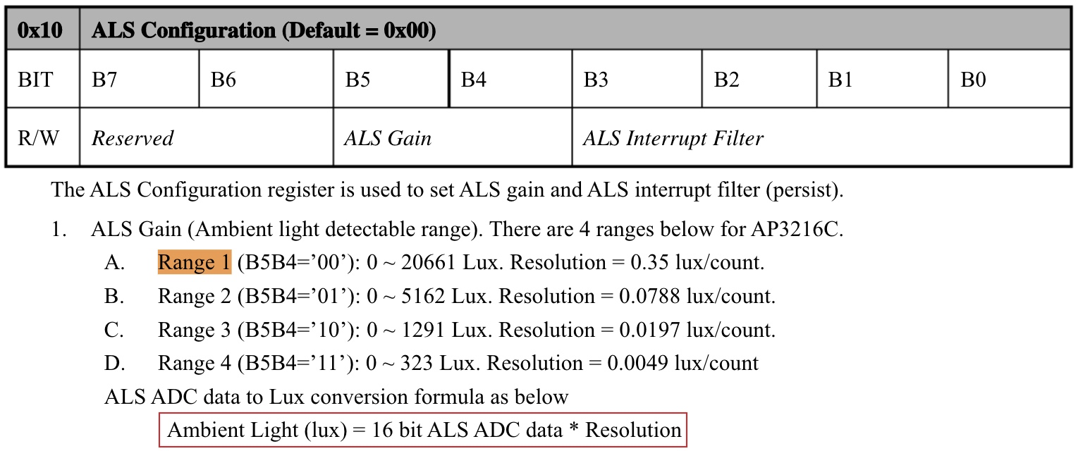 通过读取ALS数据寄存器(0x0C和0x0D)得到16bit的ADC count数据之后,需要根据ALS Configuration寄存器的ALS Gain栏位将ADC count数据根据芯片手册的说明转换成以lux为单位的亮度值。如下图所示: