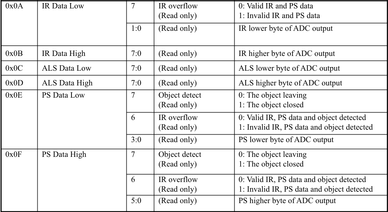 ALS、PS、IR值可以通过如下寄存器的值来获取。寄存器地址及所读取数值详细解析方法请参考下表: