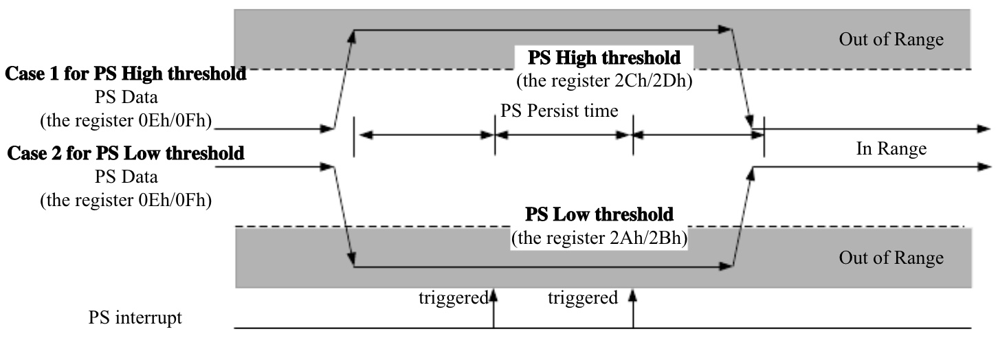 AP3216C提供中断检测功能,MCU可以设定ALS及PS中断触发门限及持续时间阈值。在环境亮度及接近程度到达门限值后持续时间超出持续时间阈值之后,会向INT管脚发送中断通知MCU进行处理。