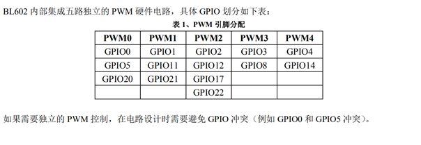 2、BL602/BL604共有五组PWM,其中GPIO与PWM对应的关系如下图: