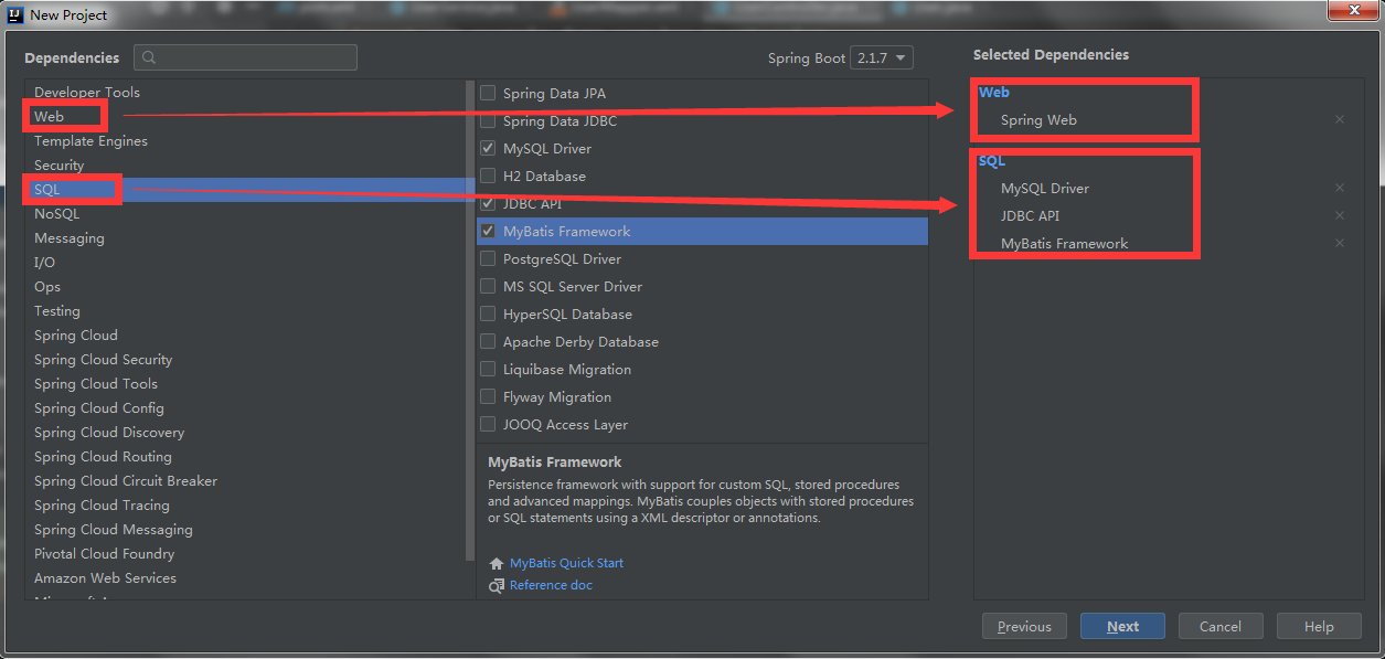 首先点击web选择spring web,再点击SQL选择MySQL driver 等,然后再一路next到新建完成。