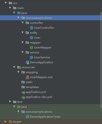 在com.example.demo包下分别创建包controller、entity、mapper、service。在resources下创建mapping文件夹。具体的代码结构如下图所示: