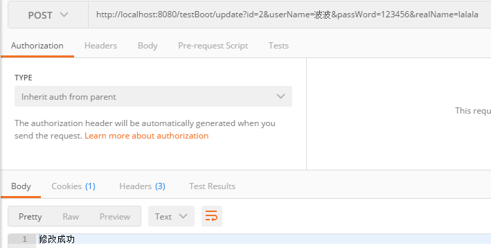 http://localhost:8080/testBoot/update?id=2&userName=波波&passWord=123456&realName=lalala
