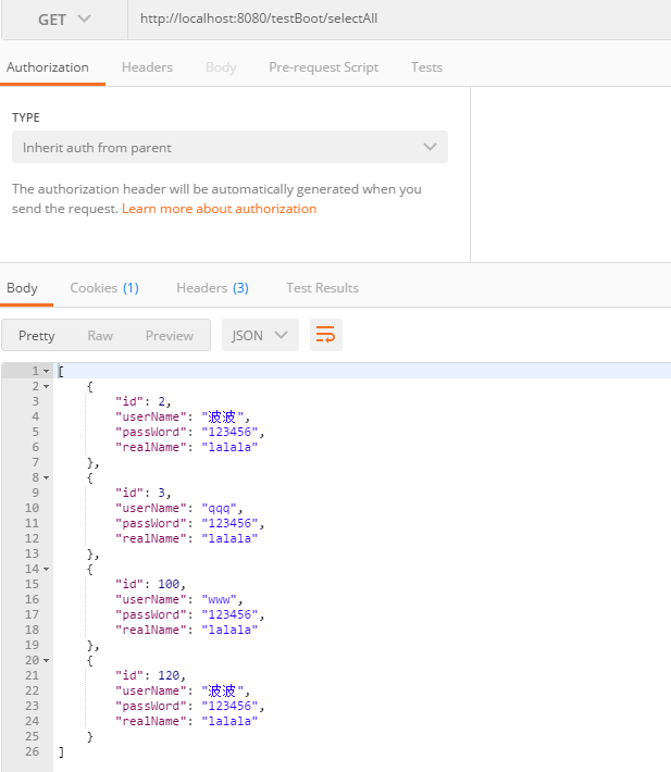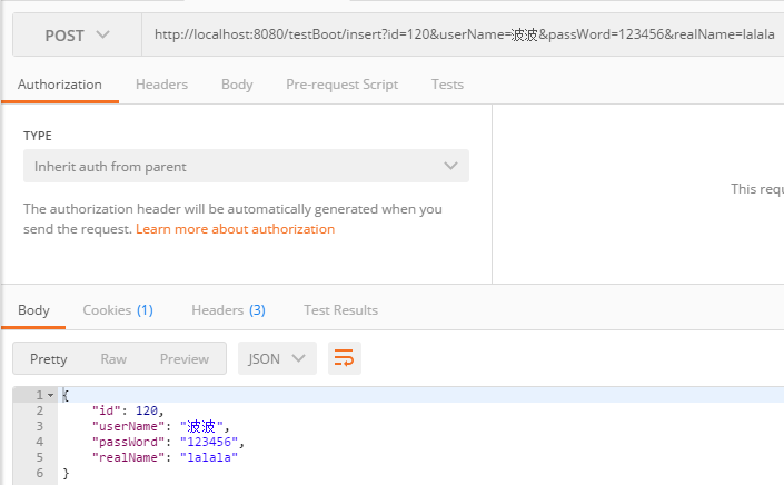 http://localhost:8080/testBoot/insert?id=120&userName=波波&passWord=123456&realName=lalala