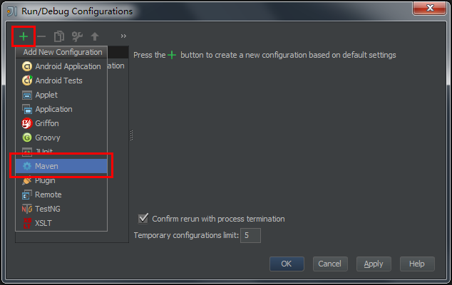 选择工具栏的"Run"-->"Edit Configurations...",打开“Run/Debug Configurations”窗口,点击绿色的“+”号按钮,在弹出的下拉列表里选择“Maven”。