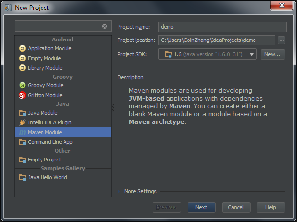 首先我们来创建一个Maven项目,项目类型选择“Maven Module”,输入项目名称“demo”。