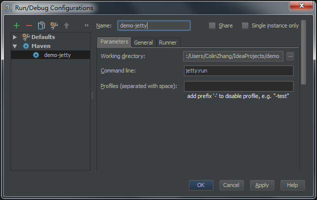 取一个名称,比如“demo-jetty”;在"Working directory"一栏选择你的工作目录,并在"Command Line"里输入“jetty:run”。然后点击“OK”。