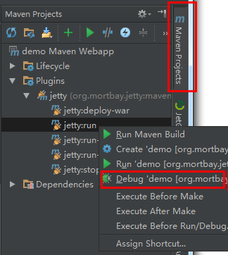 在添加了Jetty插件之后,跳过上面提到的调试配置,直接打开“Maven Projects”面板,展开 Plugins-->jetty,在“jetty:run”上点击右键,选择“Debug”即可。