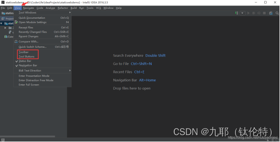对于首次创建或打开的新项目,IntelliJ IDEA 都会创建项目索引,大型项目在创建索引的过程中可能会出现卡顿的现象,因此强烈建议在 IntelliJ IDEA 创建索引的过程中不要动项目。此外,IntelliJ IDEA 的默认界面是隐藏Toolbar和Tool Buttons的,博主比较喜欢把两者显示出来,大家可以按自己的个人爱好选择开启与否。但是无论我们是否选择开启,都要知道如何开启啊,省的在我们想开启的时候却不知道如何开启不是,那岂不是尴尬啦?因此,在这里,我们选择开启Toolbar和Tool Buttons,点击View,如下图所示: