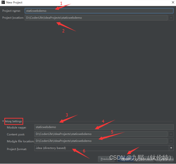 在这里,有一点需要说明,那就是:在 IntelliJ IDEA 中,Project是最大单元,没有类似于 Eclipse 的工作空间(Workspace)的概念,但是我们可以在一个 Project下创建多个Module,默认是一个Project下创建一个Module,因此才出现项目名称与模块名称默认相同的现象。一般情况下,我们是不需要在More Settings中进行修改的。接下来,点击Finish,完成项目的创建: