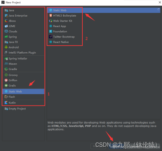 在这里,为了进一步介绍 IntelliJ IDEA,我们创建一个 Static Web 项目,点击Create New Project,进入如下界面:
