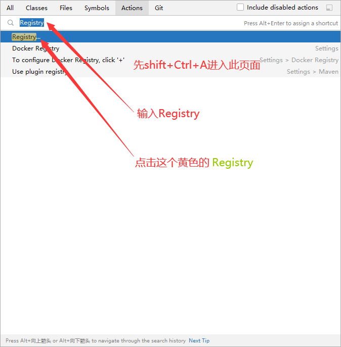 键盘快捷键shift+Ctrl+A进入下面界面→输入”Registry“→点击Registry→进入下面的界面