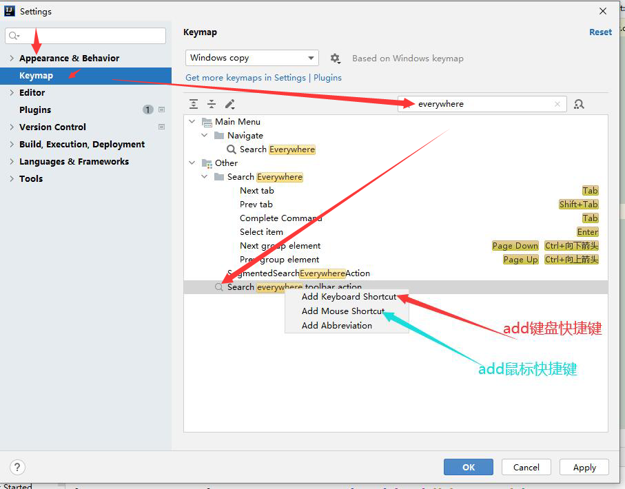 设置→keymap→输入框输入“everywhere”→修改最下面带放大镜的→add键盘快捷键→OK→还没完→下面还需要关闭全局搜索功能,还有两个步骤