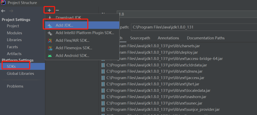 2、点击左侧标签页SDKs,点击“+”号,选择对应的jdk