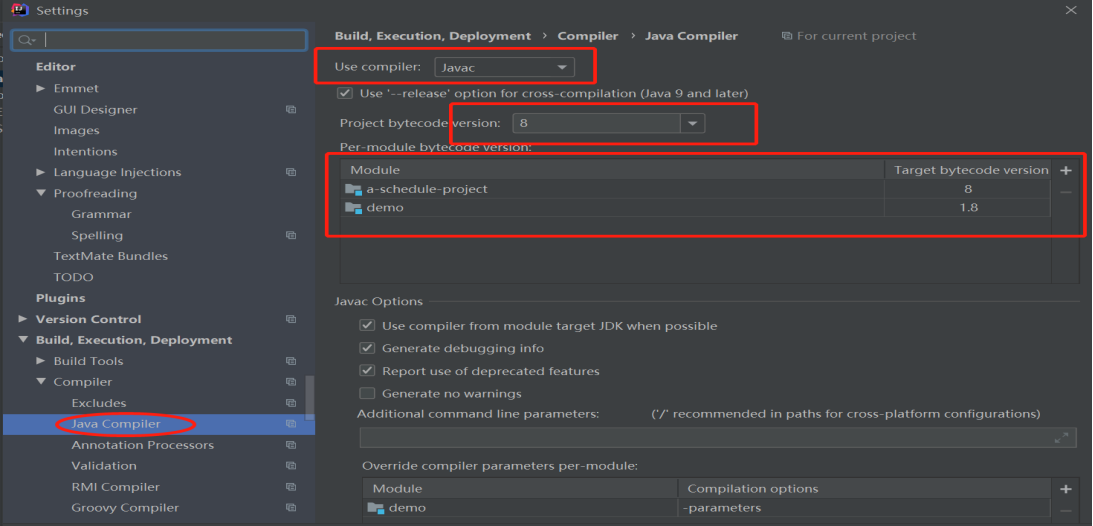 4、选中File -->Settings,在Build,Execution,Deployment下面的 Java Compiler,其中Use compiler 选择Javac,其它两个选中自己使用的jdk版本
