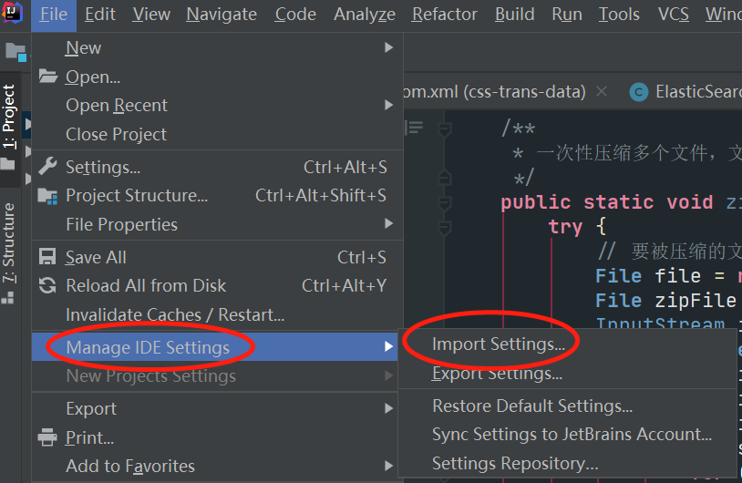 3、然后,点击 File -->Manage IDE Settings -->Import Settings,选择刚才的jar包,会提示重新启动idea