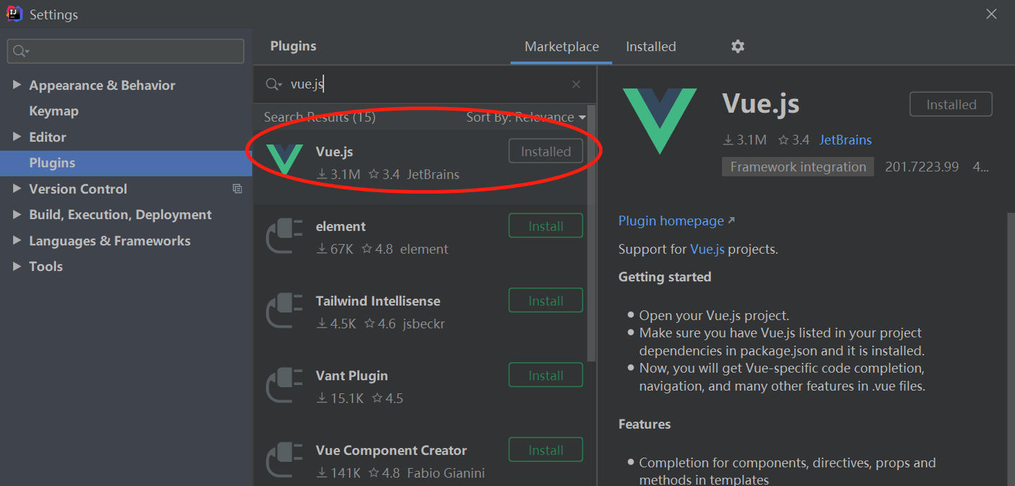 点击 File -->Settings -->Plugins 输入vue.js,install完成之后会重启idea,然后完成
